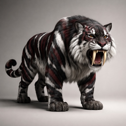 A black white grey and maroon saber tooth tiger