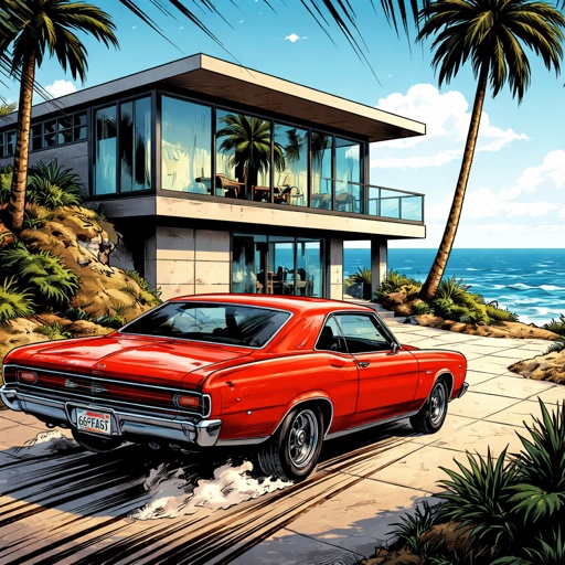 A car pulls into a driveway of a modern studio overlooking the ocean. It is mid afternoon. The car is an old-fashioned o...