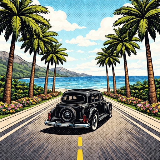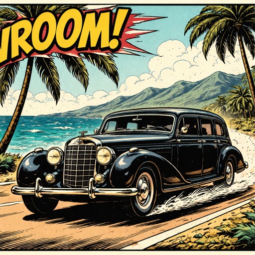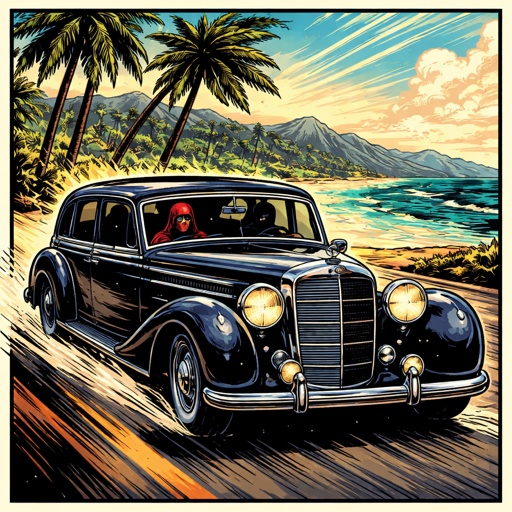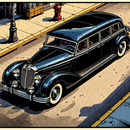 No speech bubbles, an elegant old-fashioned 1930s black limousine the scene drives into the distance on a road lined wit...
