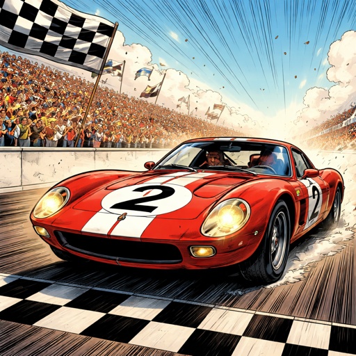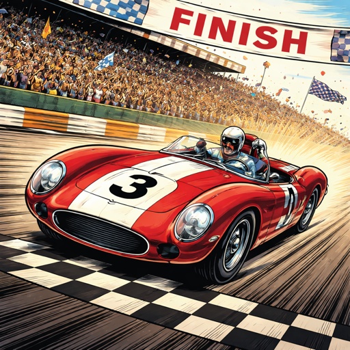 Refined realistic, no caricature a 1960s style racing car crosses the finish line going toward the left as he crosses th...