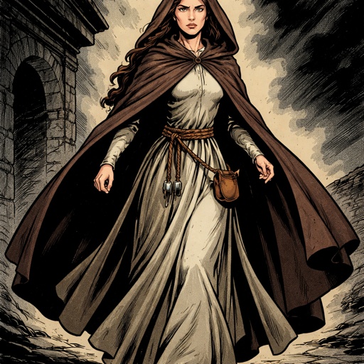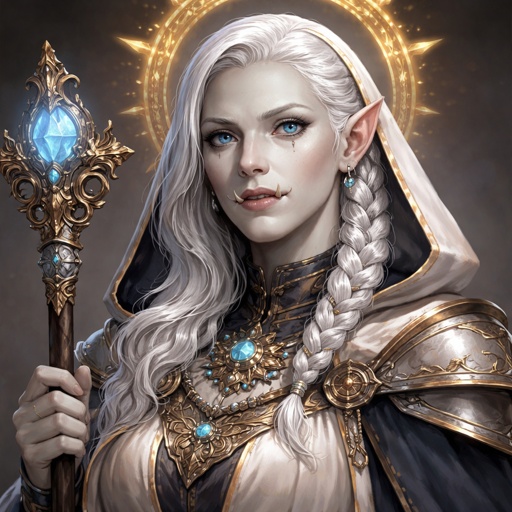 Female cleric orc medium size blue eyes white hair white skin 45years old