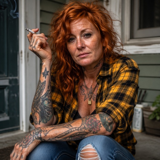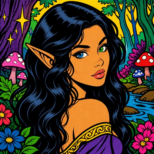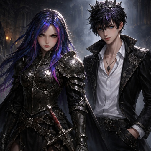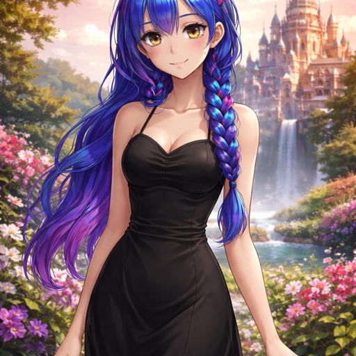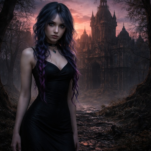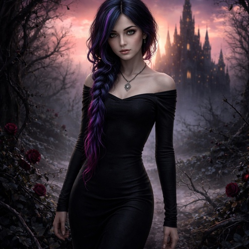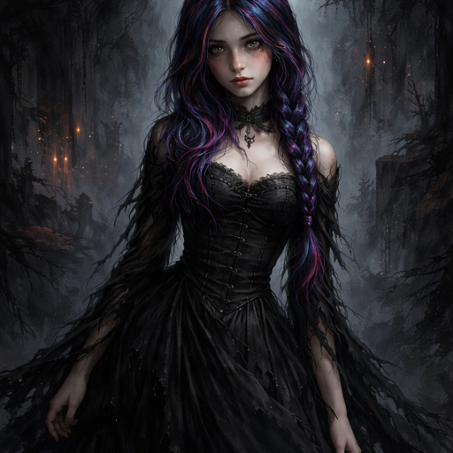 A 17 year old girl who has blue hair with purple and pink stripes and hazel eyes. She is wearing a long black dress that...