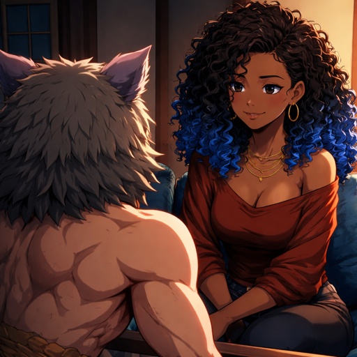 A 17 year old girl who has blue hair with purple and pink stripes and has hazel eyes. She is wearing a gray shirt and bl...