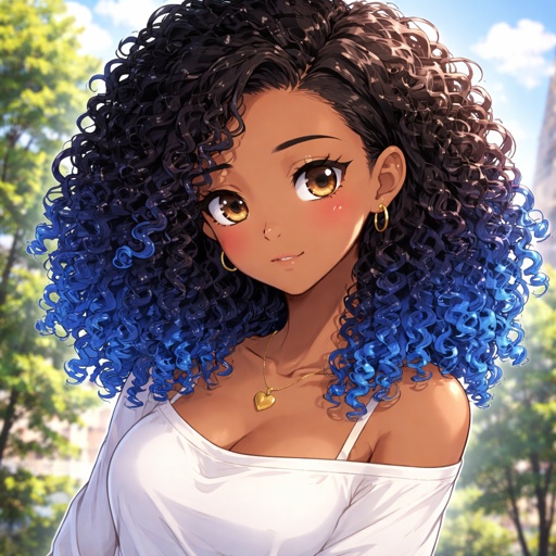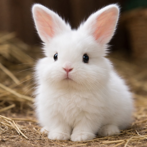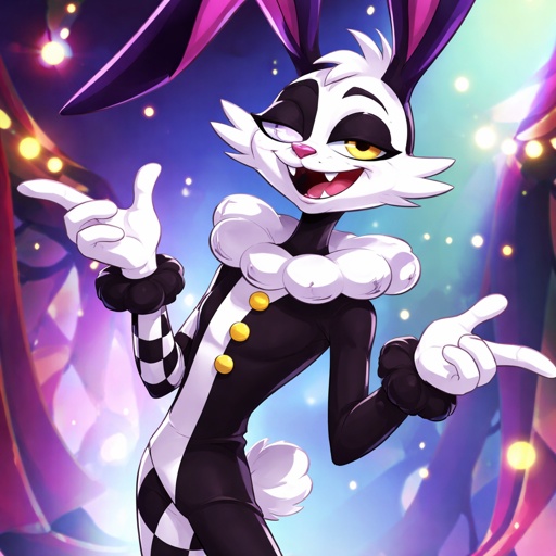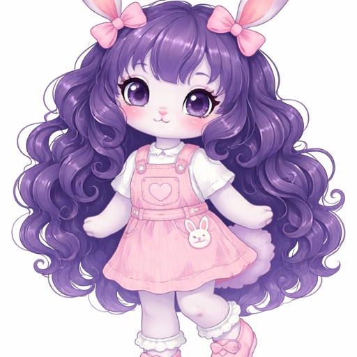 I want a girl purple bunny with purple curly hair and a pink overall dress