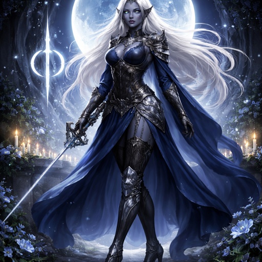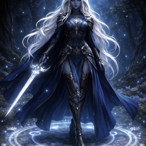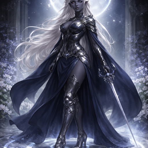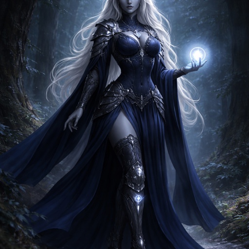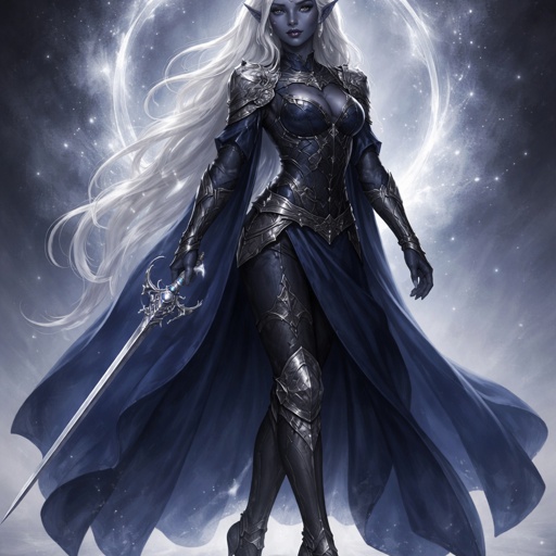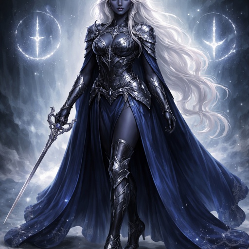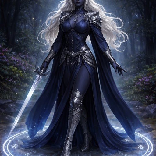 A beautiful Drow woman with long flowing white hair, dark grayish blue skin, large silver eyes, wearing dark blue flowin...