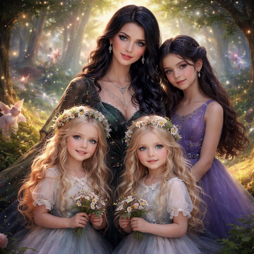 Young Twin sisters with blonde hair and a black haired women with her black haired daughter