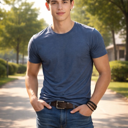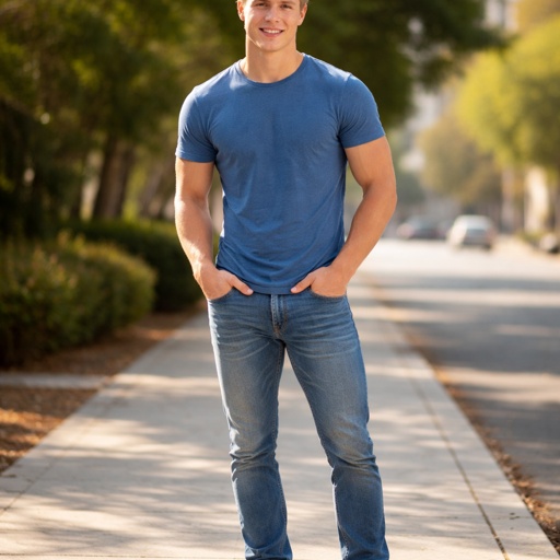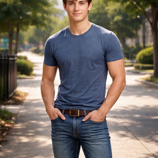 A 19 year old boy who has brown hair and brown eyes. He is wearing a blue shirt and jeans. He looks strong. Full body an...