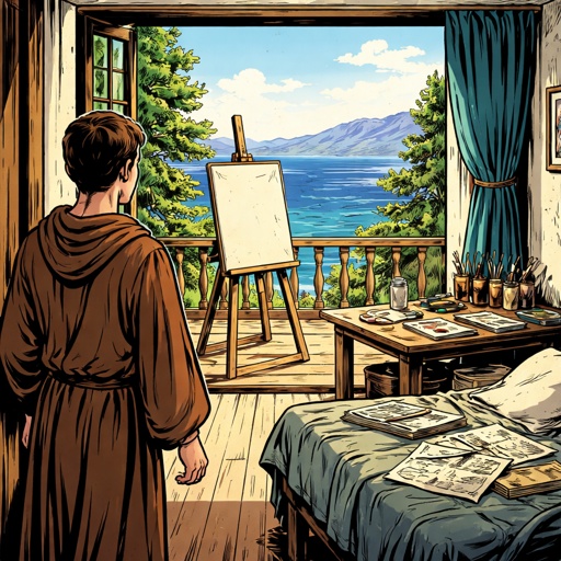 No speech bubbles, a young man and a plain renaissance robe we see him from the back he has brown hair. He’s being shown...