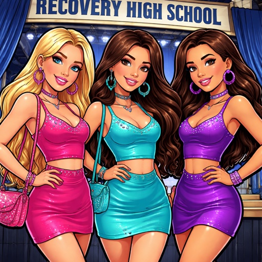 3 chicas adolescentes siendo un grupo de tres. Una chica rubia de ojos azules y piel clara; vestimenta rosa de cualquier...