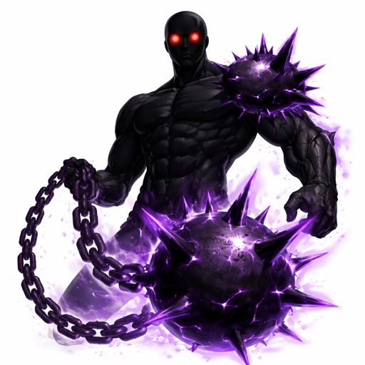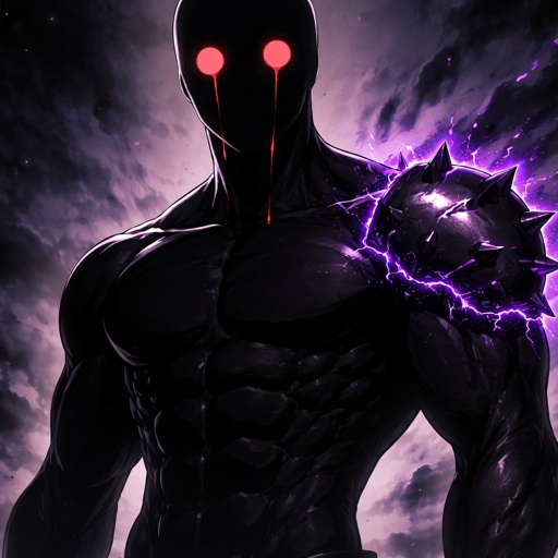 Buff, guy, pure black like the void,pure red circle eyes with no mouth or ears or nose, he has a line that droops from h...