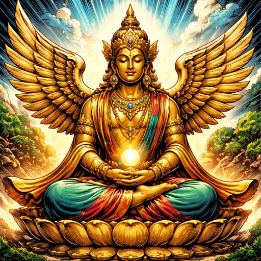 Long shot .A gold statue of an indigenous, Indian style character with golden wings in a robe in a Buddhist meditation p...