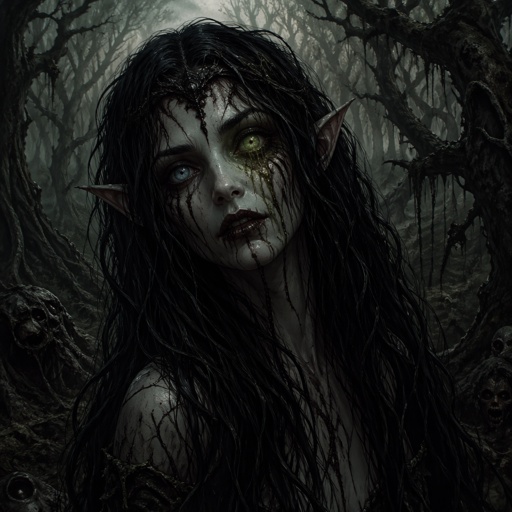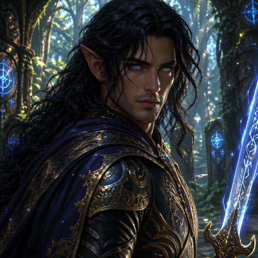 Dark elf male master swordsman wearing black leather armour and has six different swords on his back. His skin is ghost ...