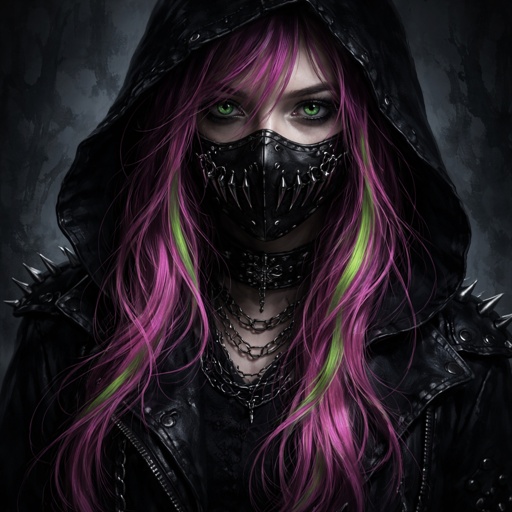 A 17 year old girl who has pink hair with green stripes and has green eyes. She is wearing all black. There is a mask th...