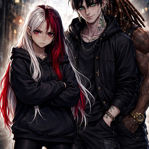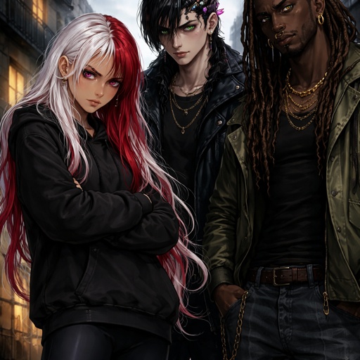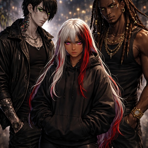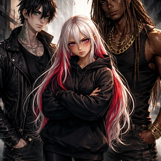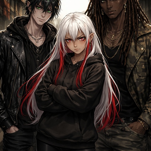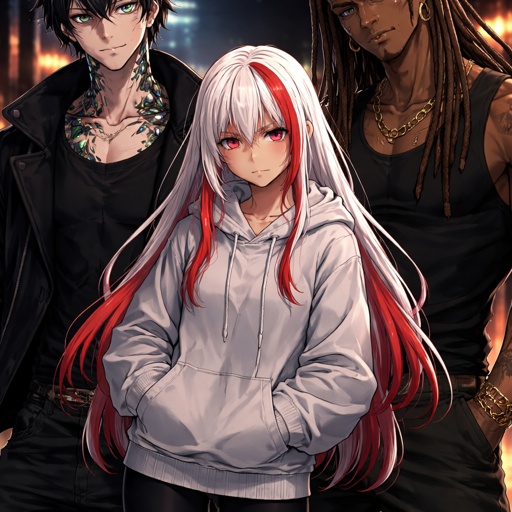 A girl with White long hair with red highlights golden skin ruby eyes she is wearing leggings and a baggy hoodie her sl...