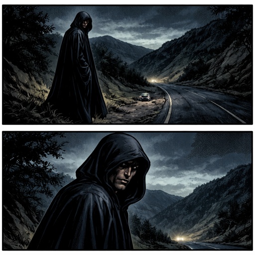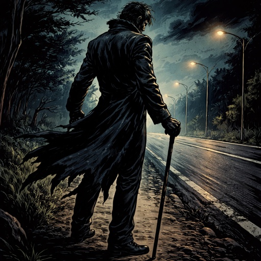 A large 7 foot guy with a large greatsword In a suit with red eyes and has a mask, him very scary with blood all over hi...