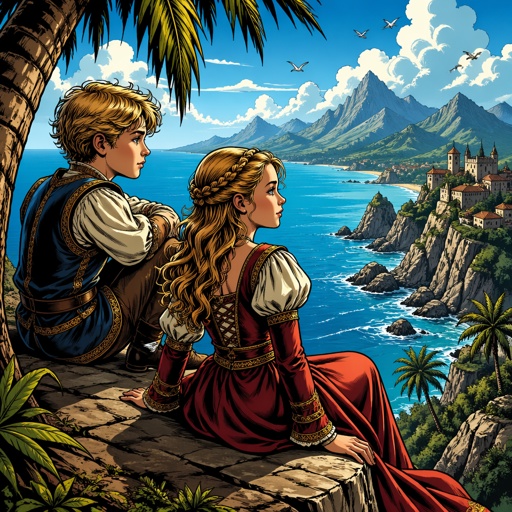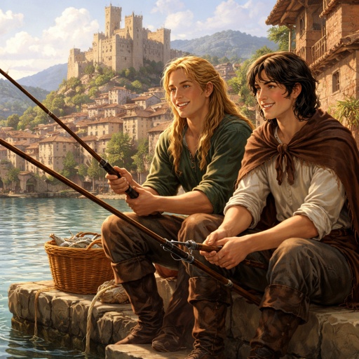Two young men in medieval tunics on a dock of an old Spanish village fishing together. One boy is tan with very long blo...