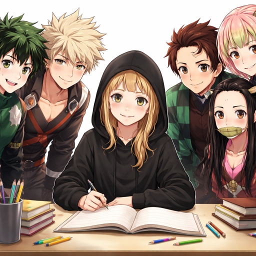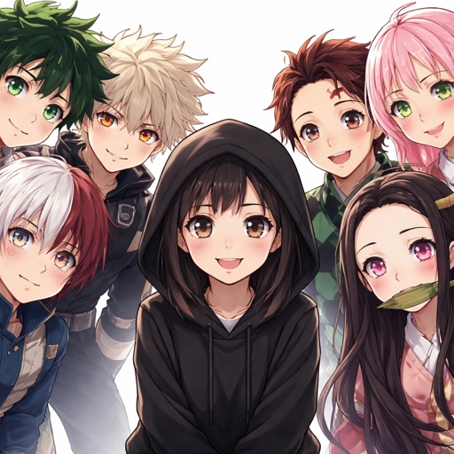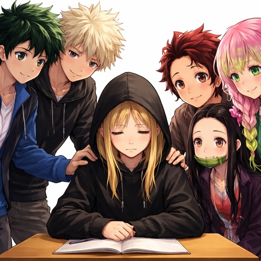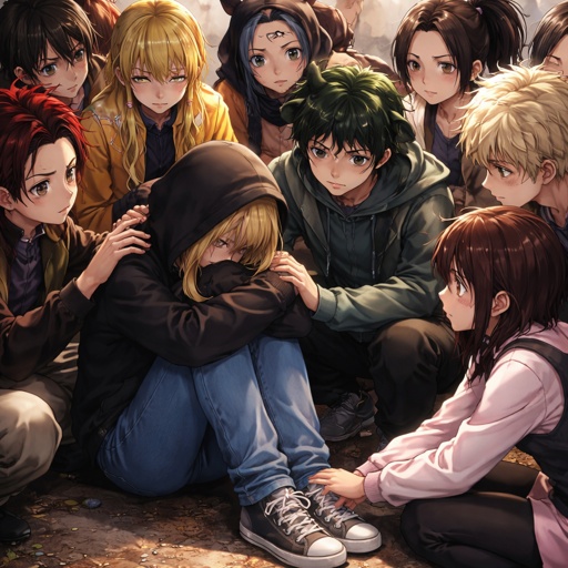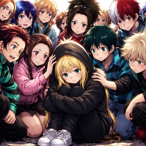 The kamado squad, and class one a comfoting a teenage blonde girl wearing a black hoodie with the hood on her head and h...