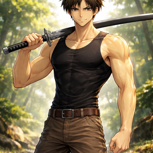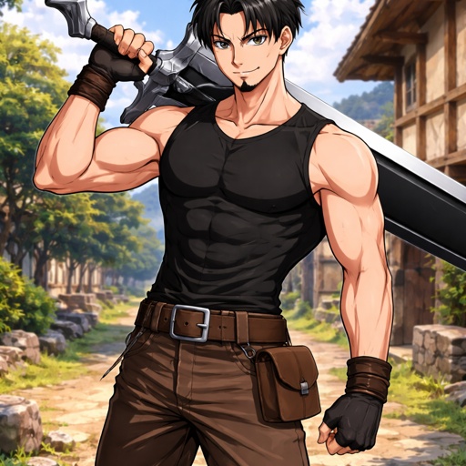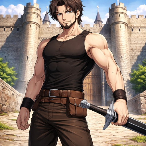 Adolescent with goatee, 6ft, slightly bulky with refined muscles, basic medieval pants with a tight black sleeveless shi...