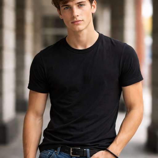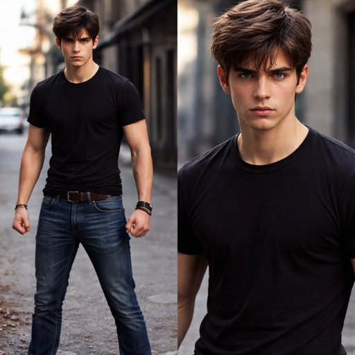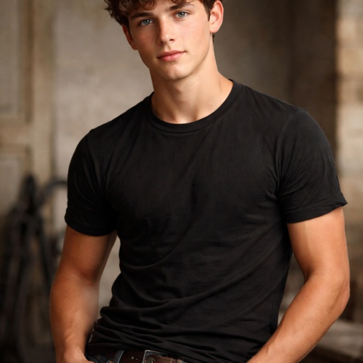 A 17 year old boy who has brown hair and blue eyes. He is wearing a black shirt and jeans. He looks strong and confiden...