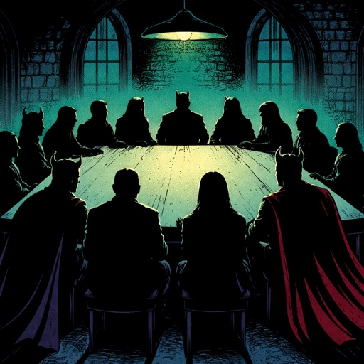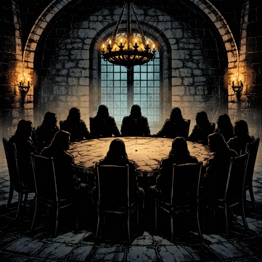 The inside of a castle room it is very dark. We only see silhouette figures around the table. There are 12 of them. The ...