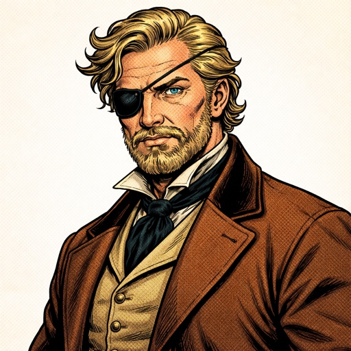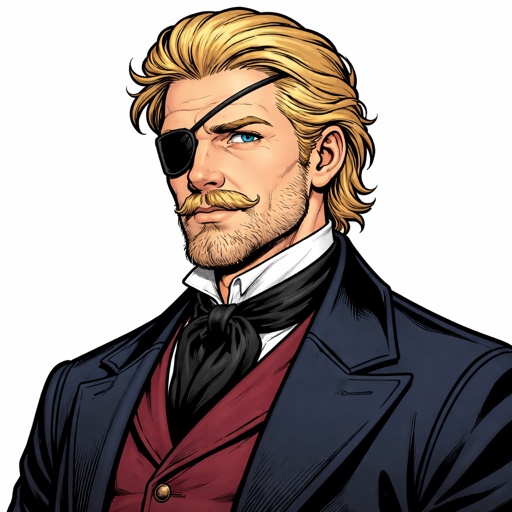 Realistic, refined, no drama, head and shoulders shot three-quarter view, middle-aged man blonde hair eyepatch over left...