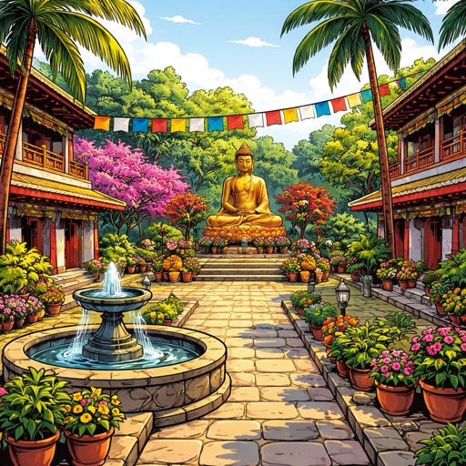 The courtyard of a Buddhist style Nunnery with palm trees and plants no speech bubbles no people