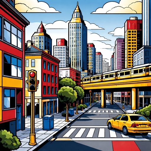 A bed that has a big window that overlooks a city at the center of the room. In the left corner of the room next to wind...
