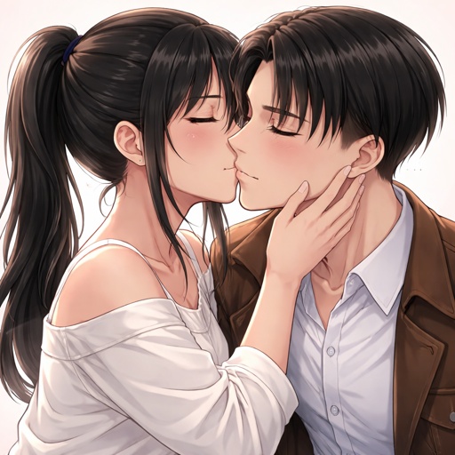 Adult girl with a dark ponytail kissing Levi Ackerman