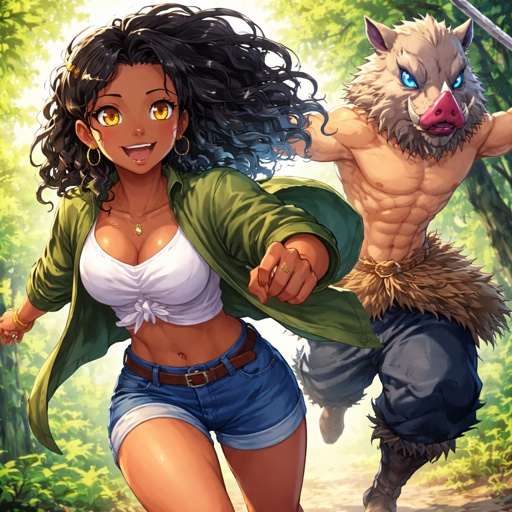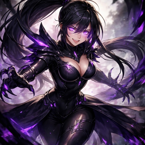 A adult pro hero girl with long hair black hair up in a ponytail wearing a nightmare inducement hero costume
