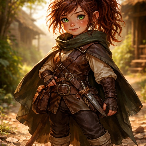 Female halfling rouge green eyes small size dark cinnamon brown red hair sun-kissed skin 10 years old