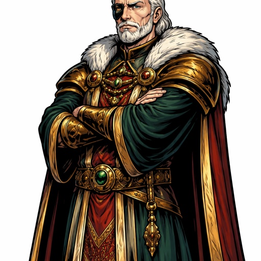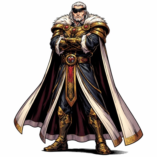 Realistic, refined, full body shot white background, no speech bubble, a tall man with a robe his arms crossed he’s wear...