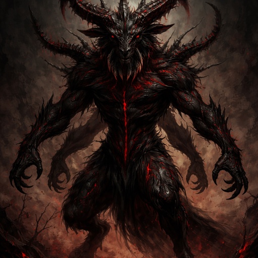 A creature who has long sharp horns on top of his head and long dull under his chin he has four arms red lines down his ...