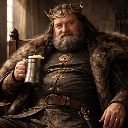 No caricature no speech bubbles very rich sly faced older bearded man wearing a Renaissance robe is sitting in an easy c...