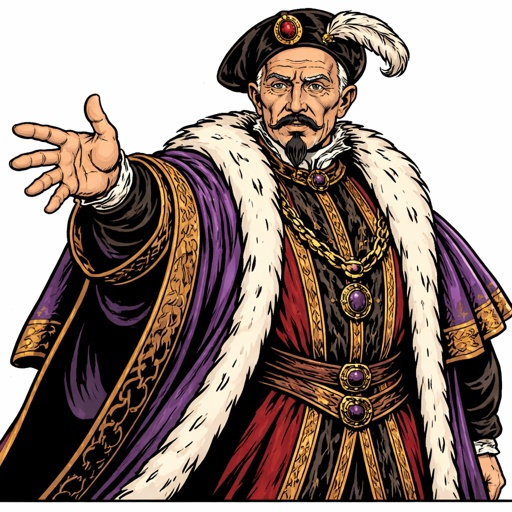 I’m very elderly bold man with a small black moustache and beard. He’s standing dressed in expensive renaissance robes h...