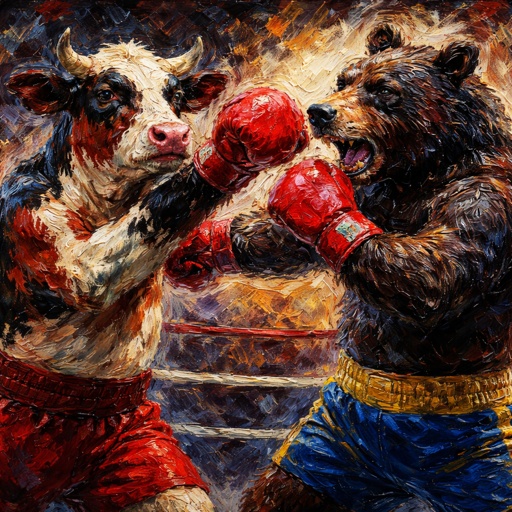 A cow red white and black boxing a maroon blue with black bear