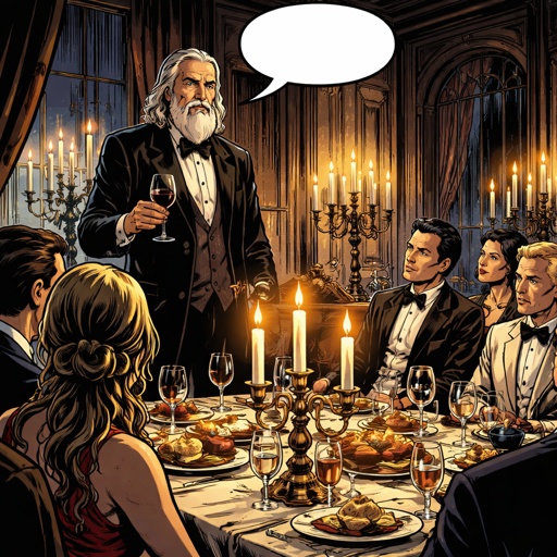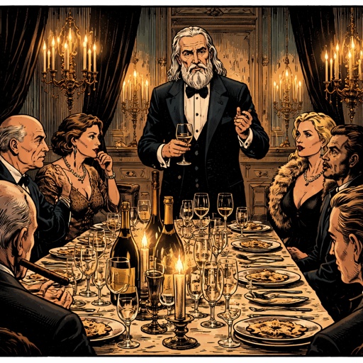 An elegant from the late 1890s very snobbish elderly upper class dinner party there are three men in tuxedos, and one wo...