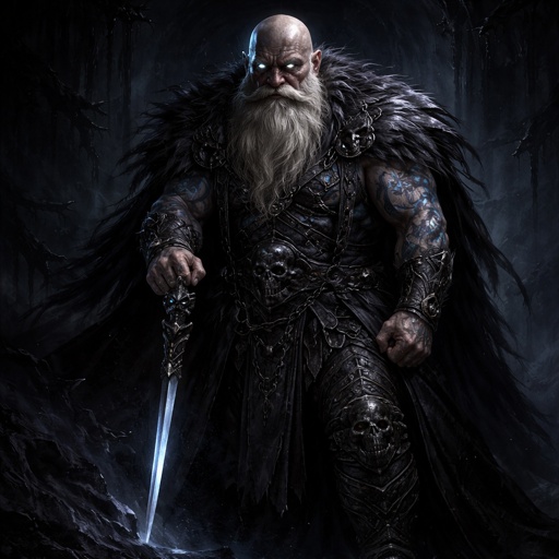 A elder dwarf thick white beard bald head 6 foot tall muscular blue tattoos and has a cane that has a blade inside of i...