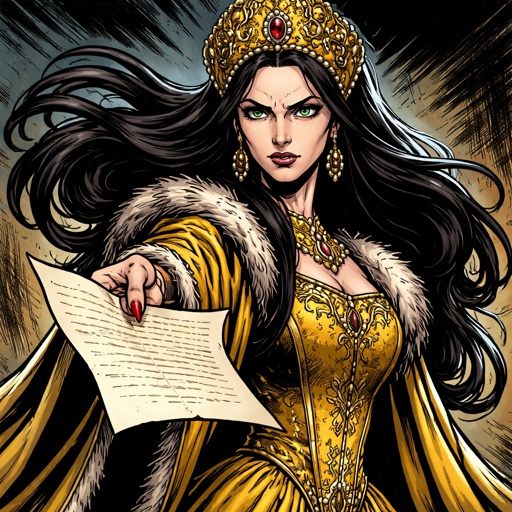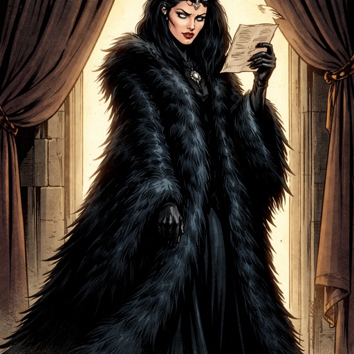 A tall, slim princess completely covered in a black fur robe with headdress full body shot in her right hand is a letter...
