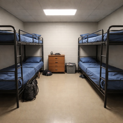 A big room that has 2 sets of bunk beds. There’s no windows and the bed sheets are blue.