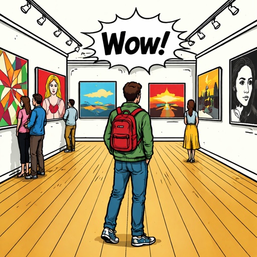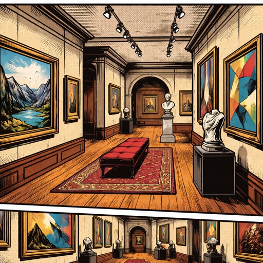A huge room and has white floors and has gold and silver specks on the wall. In the center of the room are stairs. The s...