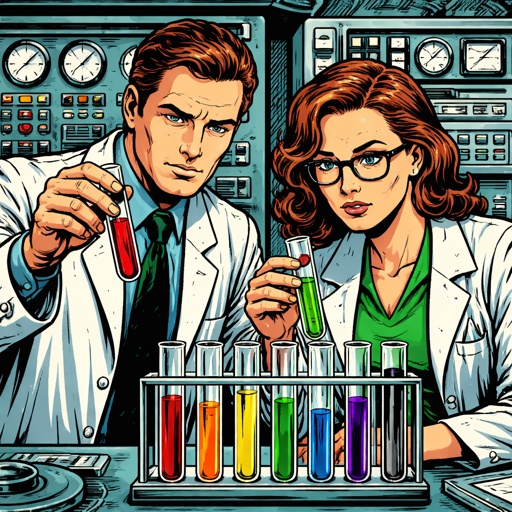 Realistic refined, two scientist spend over a series of colourful test tubes. When is male one is female. They are serio...