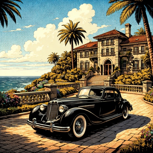 afternoon. A 1930s style car is parked in the driveway of a large mansion which overlooks the ocean.