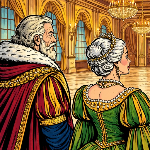 Three-quarter rearview of an elderly couple, very wealthy in Renaissance robes. The old man has a blonde gray beard and ...