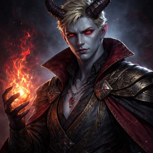 Male Tiefling sorcerer medium size red demon eyes blonde hair pale grey blue skin 666 years old