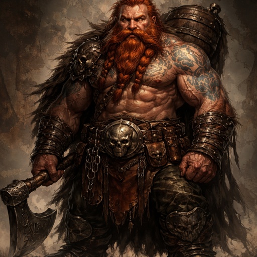 A muscular 6 foot tall dwarf with red hair and thick mustache and tattoos
