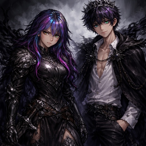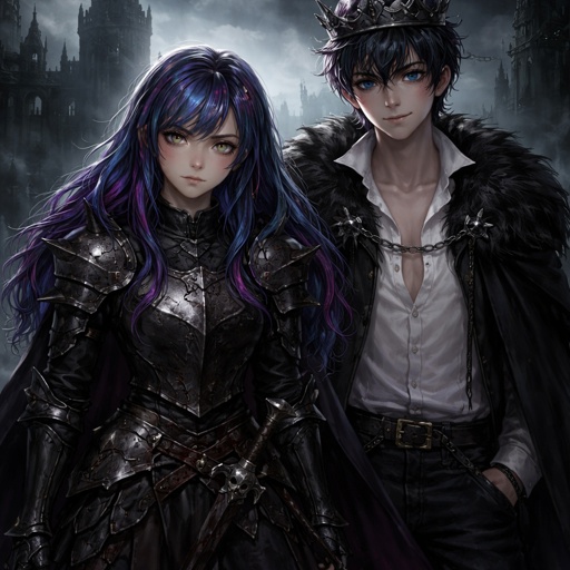 A 17 year old girl who has blue hair with purple and pink stripes and hazel eyes. She is wearing a knight’s armor. She l...
