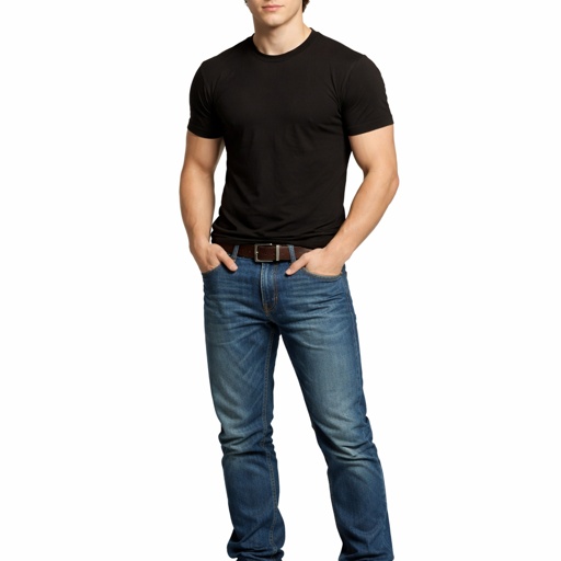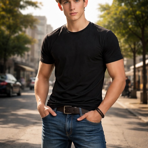 A 17 year old boy who has brown hair and blue eyes. He is wearing a black shirt and jeans. He looks strong. Full body a...