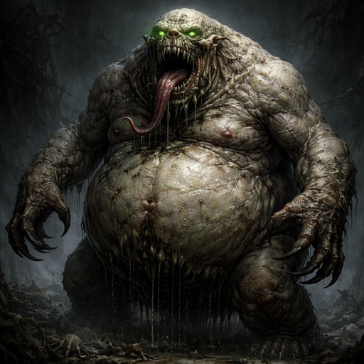 A 15 foot tall fat blubber monster on two short stubby feet but a big fat belly long arms and fat hands sharp teeth with...