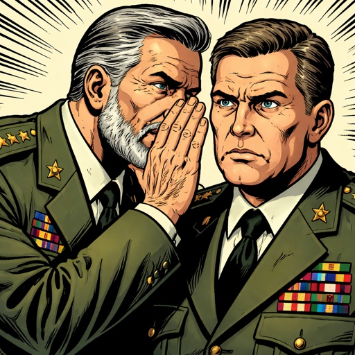 Two middle-aged generals are standing very close together one is older and has a beard. Both have very serious expressio...