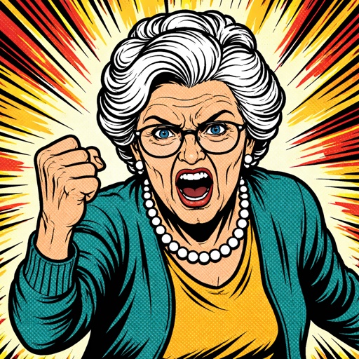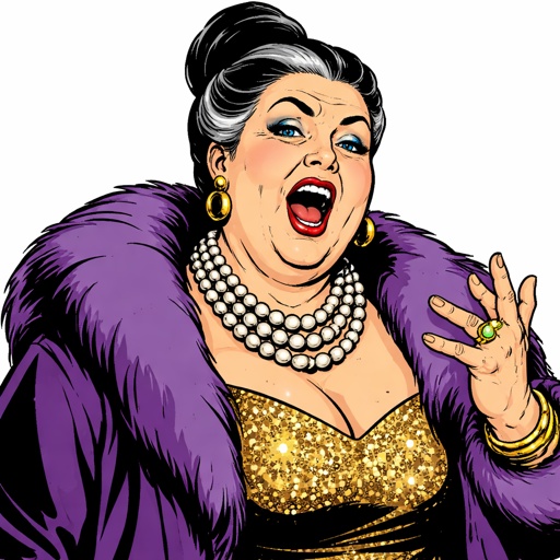A very wealthy, elite, elderly woman, fairly realistic, overweight, her mouth opened as if she’s speaking black hair tie...